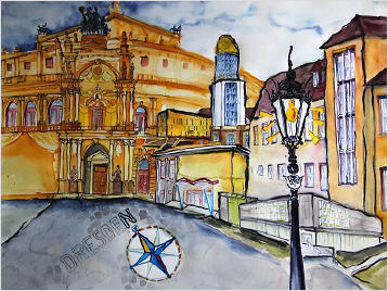 Das Bild zeigt die Semperoper und verschiedene Universitätsgebäude.